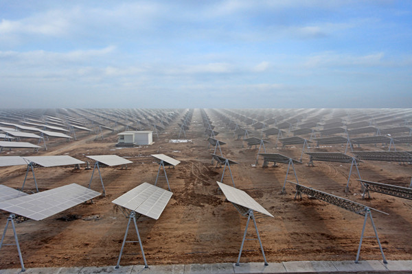 寧夏中衛(wèi)并網(wǎng)光伏電站總規(guī)模:太陽能光伏電池組件裝機(jī)容量共60MWp,一二期電站工程采用恩菲自主研發(fā)的8°角斜單軸智能柔性聯(lián)動追日跟蹤系統(tǒng),于2011年12月并網(wǎng)并投入運(yùn)營;三期電站工程采用固定式支架安裝方式,于2013年1月并網(wǎng)并投入運(yùn)營。